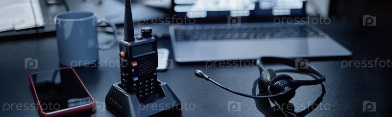 Ключевое изображение Walkie Talkie и Headset на рабочем столе в современной офисной обстановке