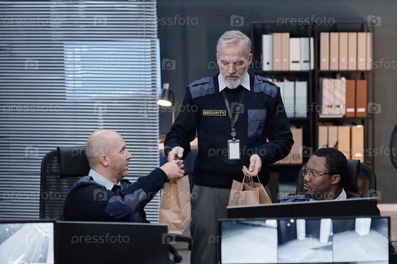 Охранники среднего возраста делятся обедом в офисной комнате наблюдения