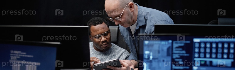 Мужчина среднего возраста обучает молодого чернокожего взрослого человека использованию цифрового планшета