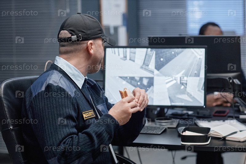 Охранник среднего возраста ест бутерброд, наблюдая за системой видеонаблюдения