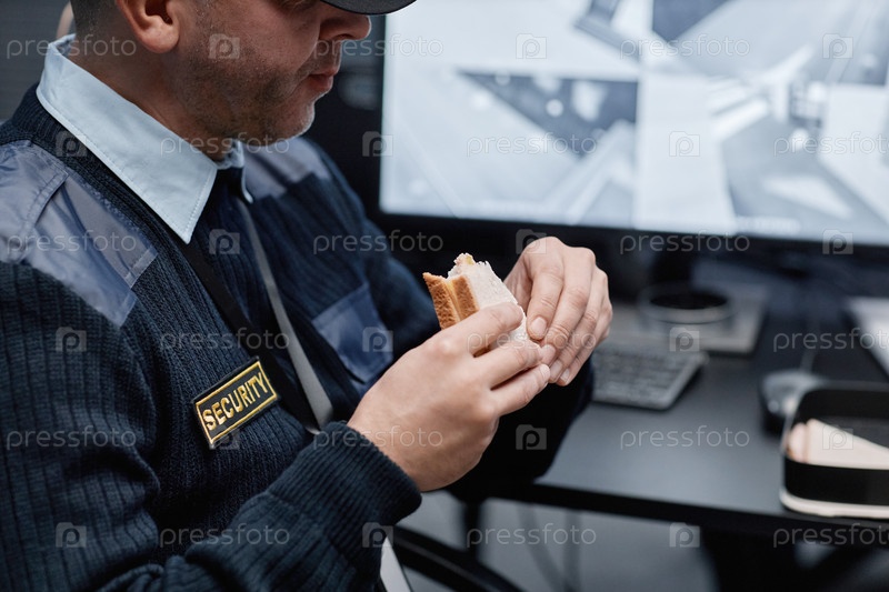 Охранник среднего возраста ест бутерброд, наблюдая за экранами
