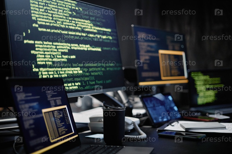 Несколько компьютерных мониторов, отображающих программный код в современной офисной обстановке