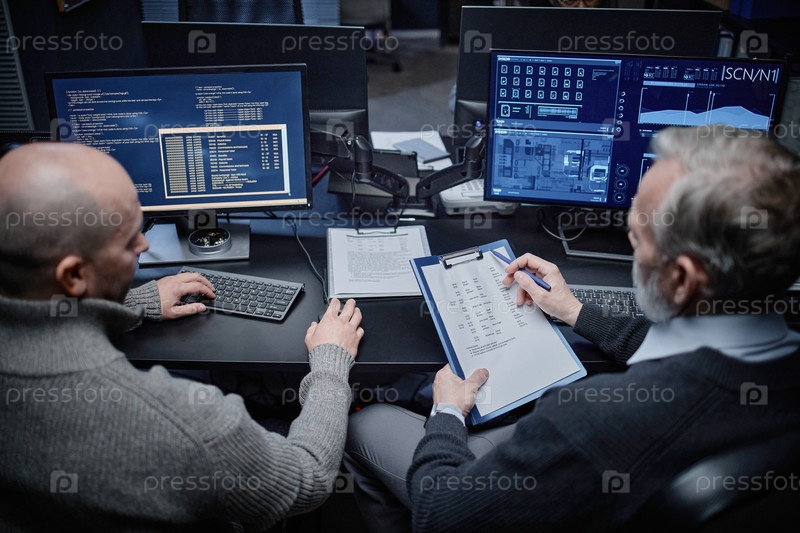 Мужчины среднего возраста анализируют данные о кибербезопасности на компьютерных мониторах