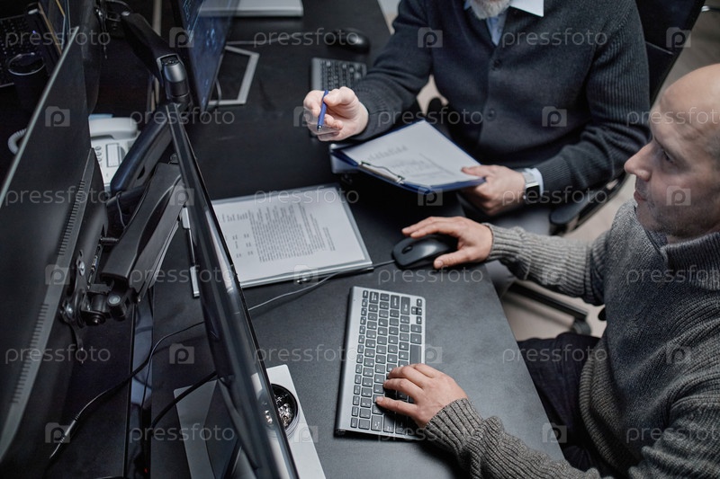 Мужчины среднего возраста, сотрудничающие на компьютере в современной офисной обстановке