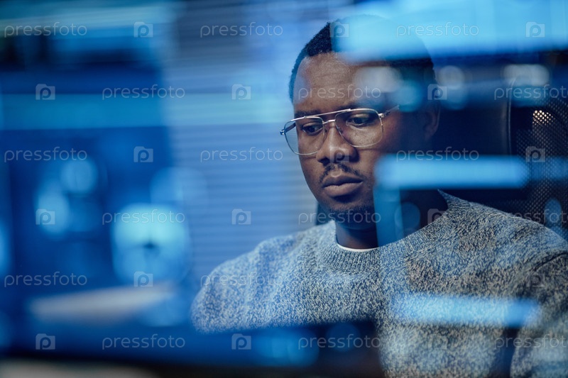 Молодой взрослый чернокожий мужчина фокусируется на экране компьютера, работая в офисе
