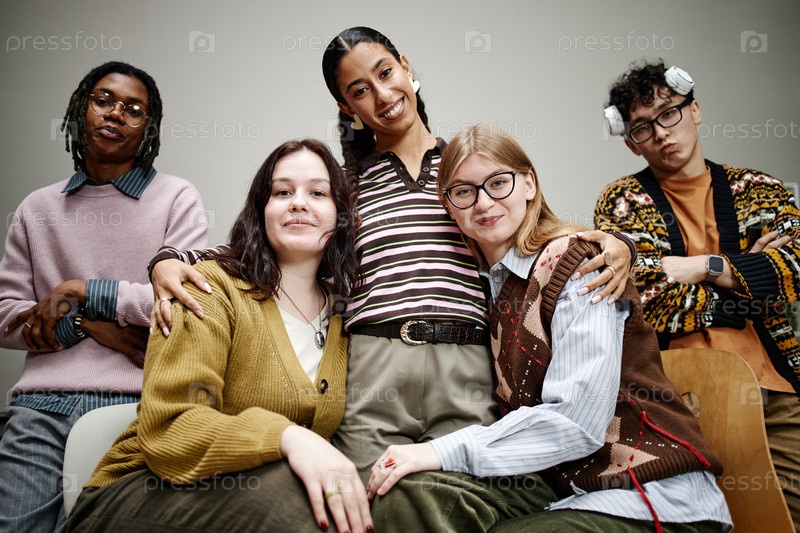 Разнообразная группа молодых взрослых, улыбающихся и позирующих вместе в помещении