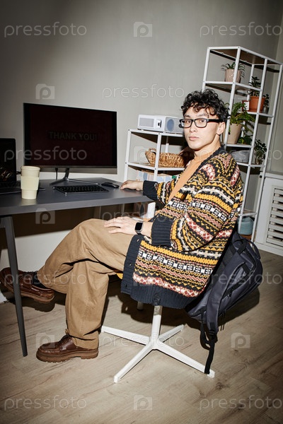 Портрет молодого взрослого мужчины, сидящего за рабочим столом и использующего компьютерный монитор
