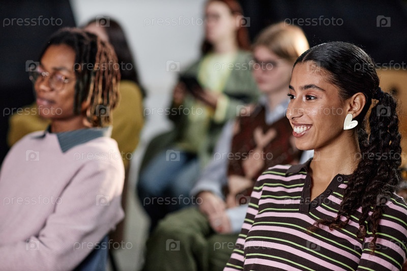 Молодые мультиэтнические взрослые посещают семинар и внимательно слушают в помещении