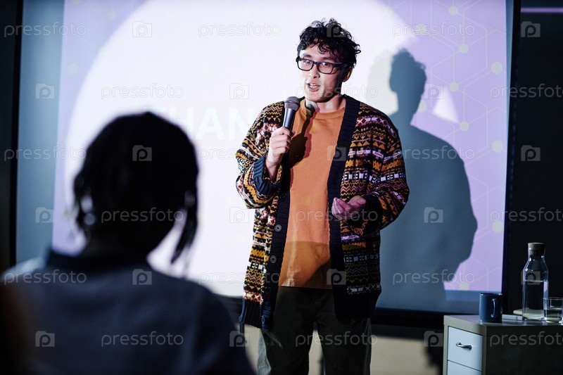 Молодой взрослый мужчина говорит в микрофон во время презентации