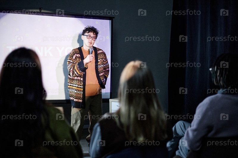 Молодой взрослый мужчина дает презентацию для разнообразной аудитории в помещении