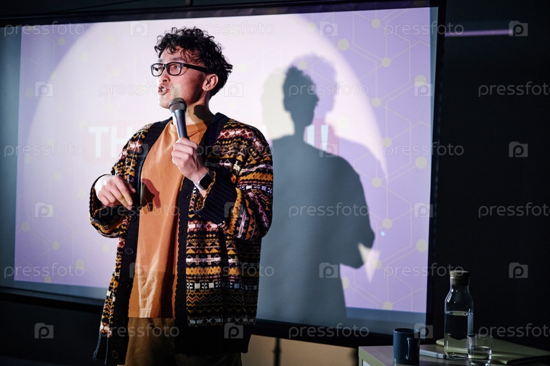 Молодой взрослый мужчина дает презентацию с микрофоном на сцене