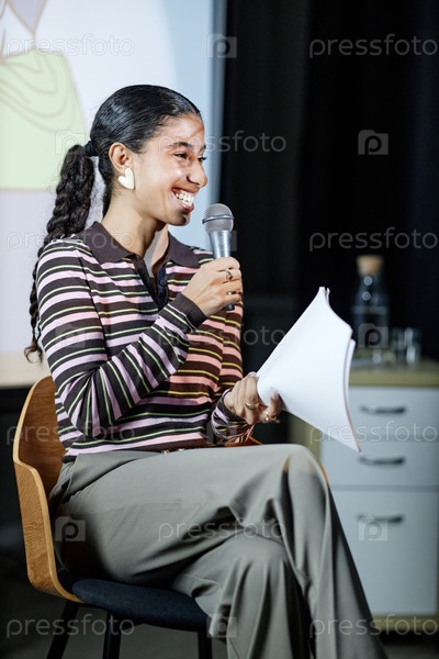 Молодая взрослая женщина улыбается, говоря в микрофон на сцене