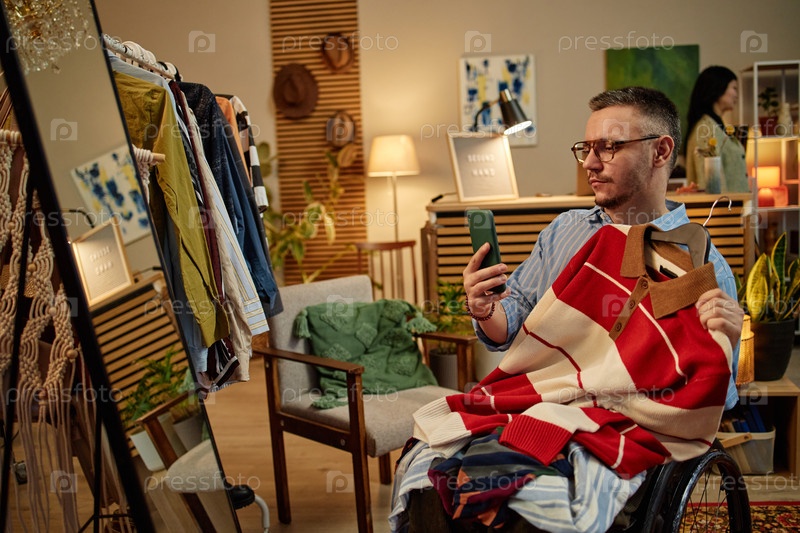 Мужчина среднего возраста в инвалидном кресле фотографирует одежду в магазине