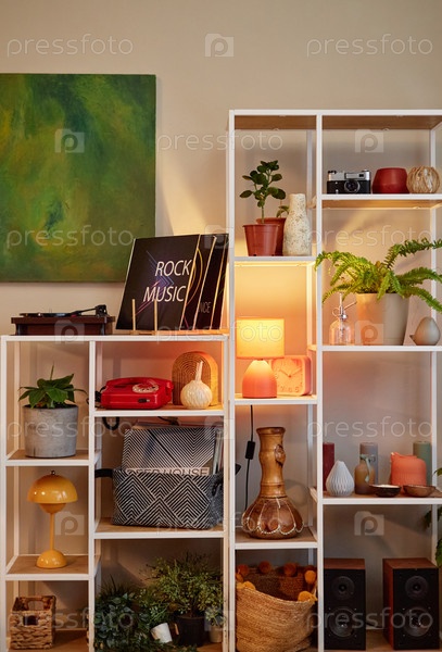 Подержанные предметы домашнего декора расположены на полках в обстановке гостиной
