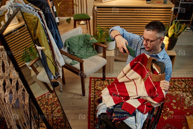 Мужчина среднего возраста в инвалидном кресле фотографирует одежду подержанную
