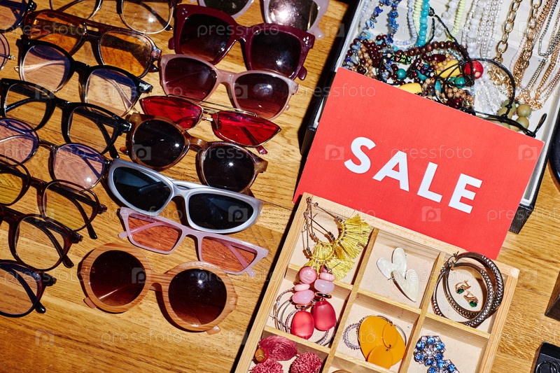 Ассортимент солнцезащитных очков и ювелирных изделий второй руки, отображаемых во время торгового мероприятия