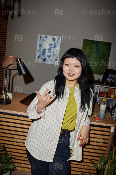 Портрет молодой взрослой азиатской женщины, улыбающейся и жестикулирующей в магазине подержанной продукции