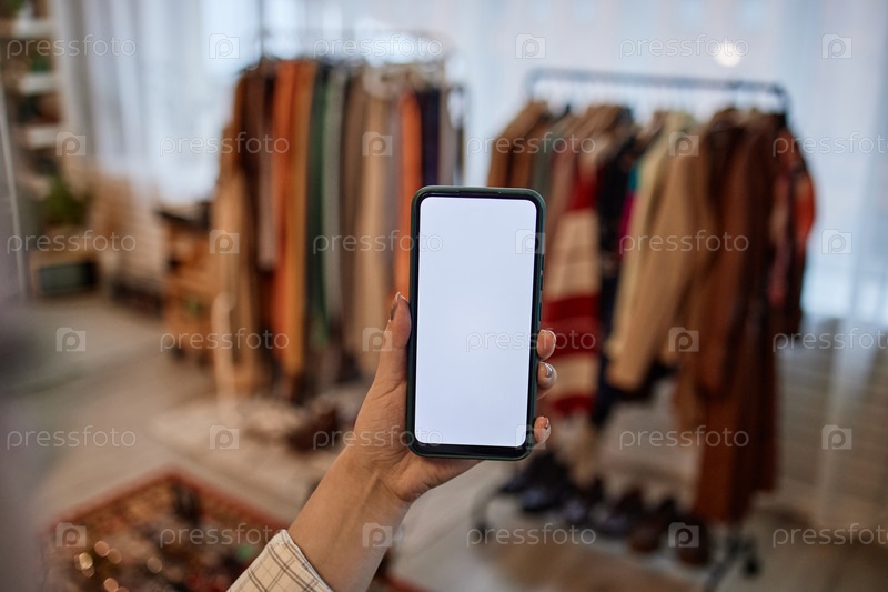 Молодая взрослая женщина держит смартфон, покупая одежду подержанную