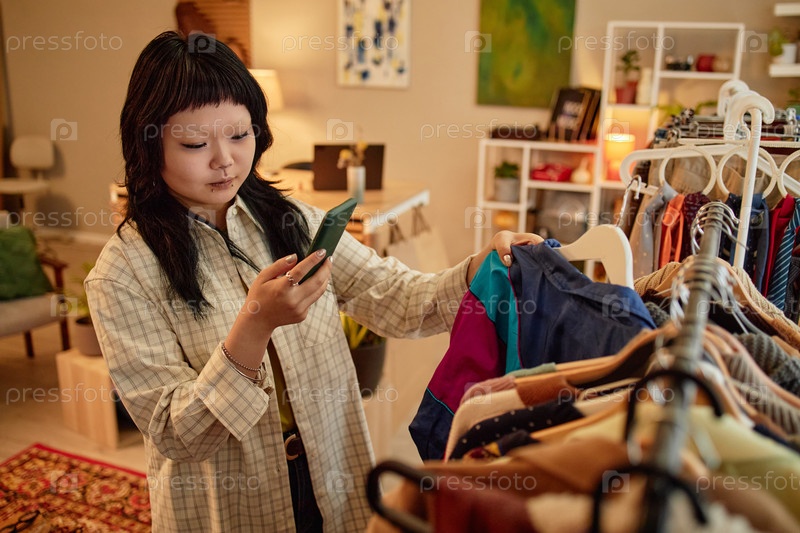 Молодая взрослая азиатская женщина просматривает одежду подержанную и использует смартфон