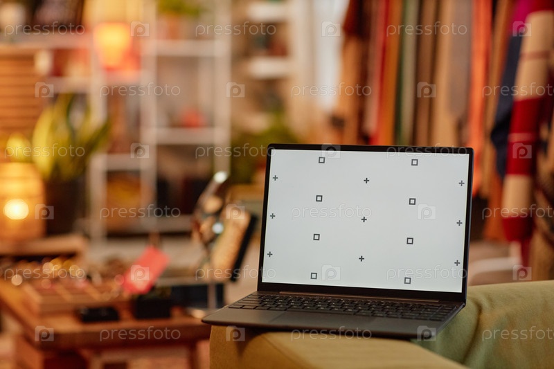 Ноутбук, отображающий пустой экран Standing in Second Hand Clothing Store