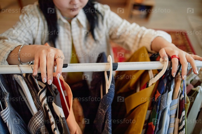 Молодая взрослая азиатская женщина просматривает раковину для одежды второй руки в помещении