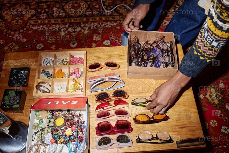 Молодой взрослый чернокожий мужчина выбирает солнцезащитные очки второй руки на столе винтажного рынка