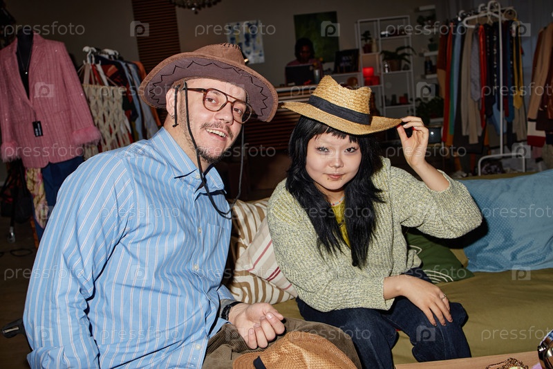 Молодой мужчина и молодая азиатская женщина пробуют подержанные шляпы в помещении