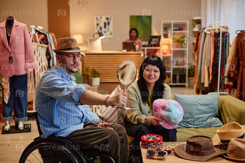 Инвалид пробует шляпу с азиатской женщиной, покупающей мужчину подержанного