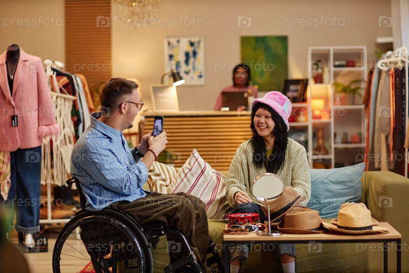 Мужчина с инвалидностью фотографирует молодую азиатскую женщину в магазине подержанных изделий