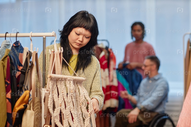 Молодая азиатская женщина просматривает одежду подержанную с различными людьми в магазине