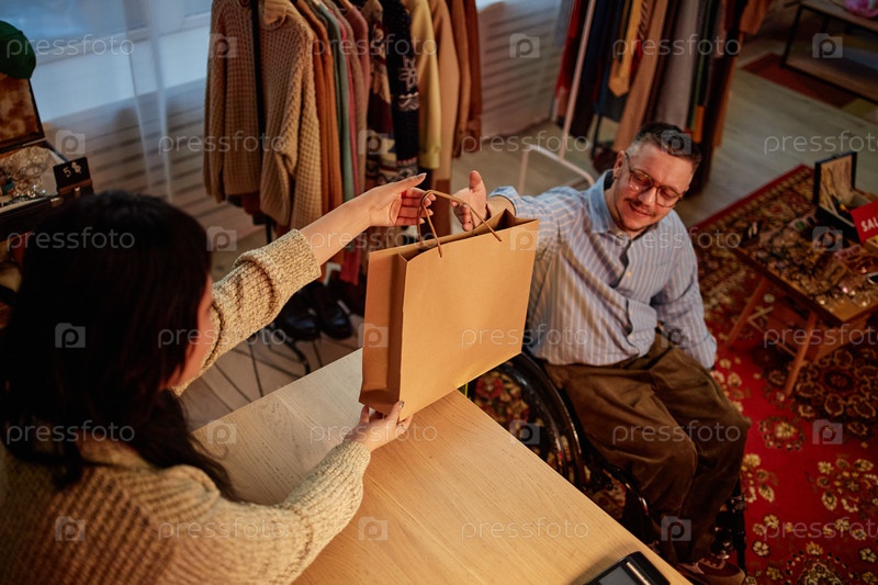 Взрослый мужчина на инвалидном кресле получает сумку для покупок в магазине подержанных товаров