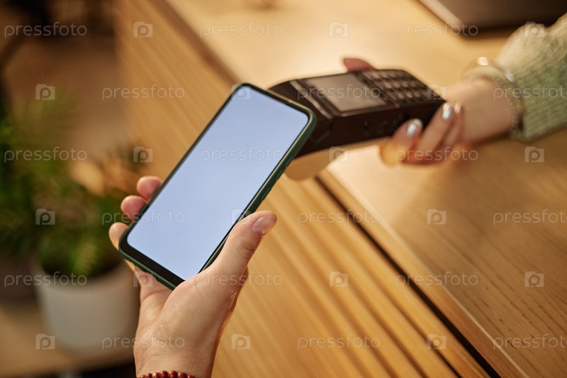 Молодая взрослая женщина платит за подержанный товар с помощью смартфона