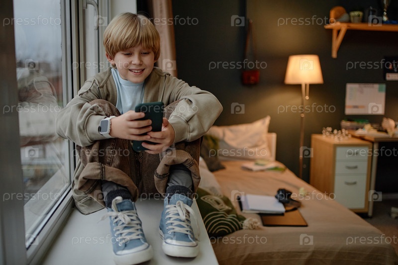 Мальчик, сидящий у окна с помощью смартфона в уютной обстановке спальни
