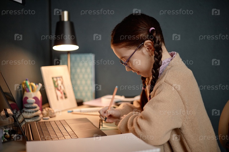 Девочка-ребенок пишет записки во время учебы за рабочим столом, используя ноутбук