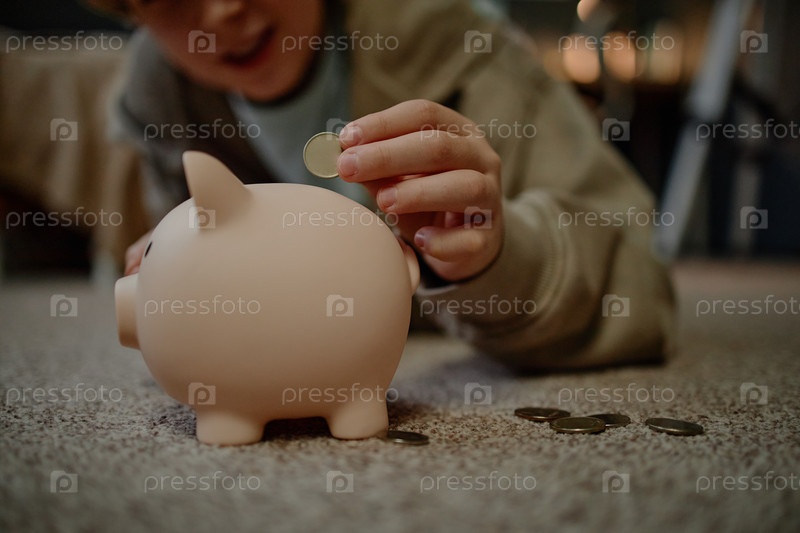Чудотворный ребенок экономит деньги, положив монету в свинину
