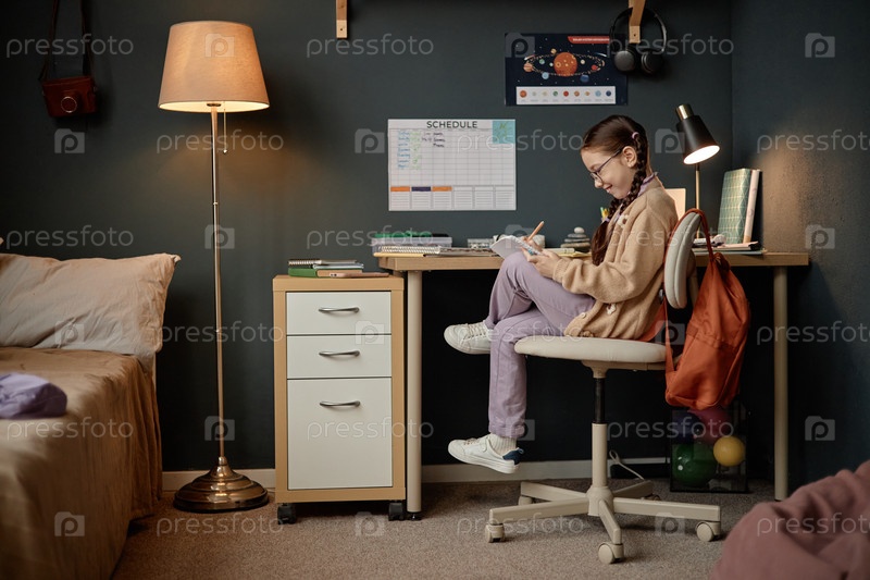 Девочка-провидение сосредотачивается на академических задачах за столом учебы в помещении