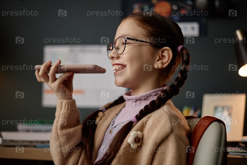 Девочка-чудо использует голосовой ассистент смартфона, улыбаясь