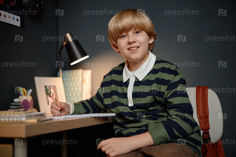 Портрет мальчика-ребенка, улыбающегося при решении домашних заданий за столом