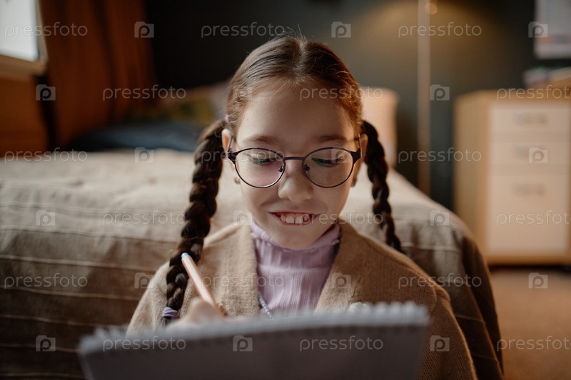 Портрет девочки-чудотворца, пишущей в блокноте и улыбающейся