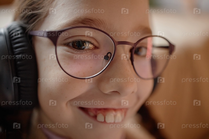 Портрет девочки-ребенка, улыбающейся уверенно при ношении наушников