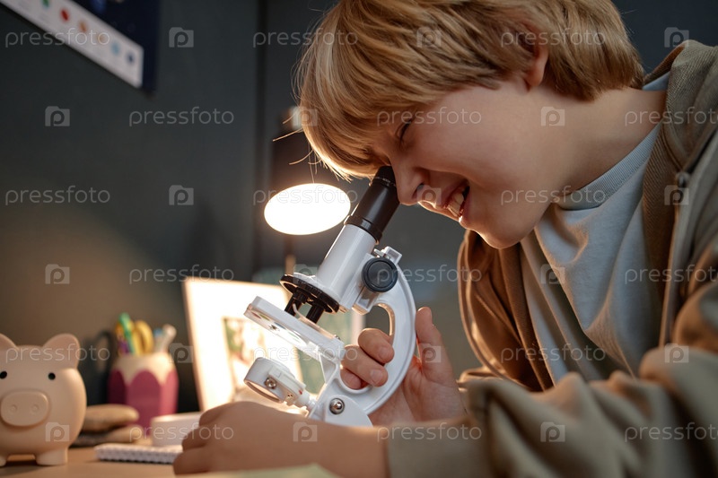 Мальчик изучает научный эксперимент с использованием микроскопа в помещении