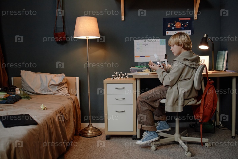Модель наблюдения за рабочим столом в увеличении демонстрирует навыки чудотворного мальчика