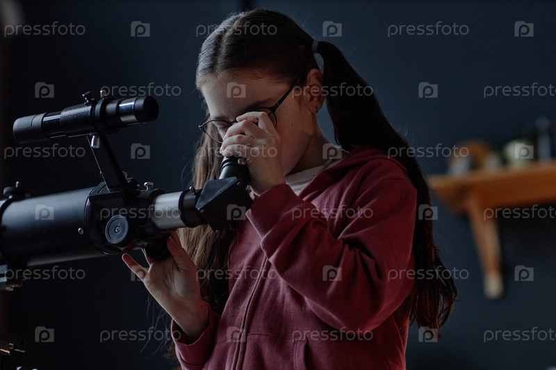 Девочка-ребенок изучает астрономию с помощью телескопа, демонстрируя навыки чудотворца