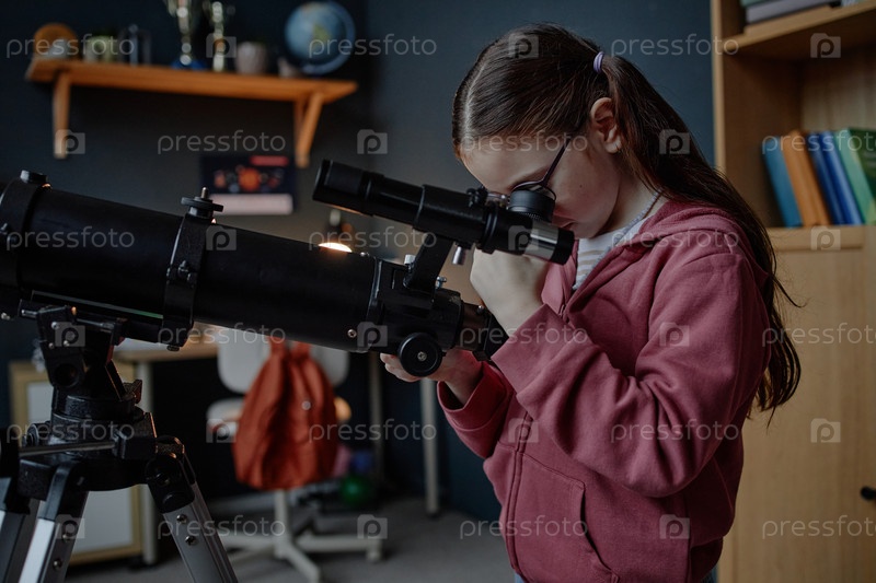 Девочка-ребенок изучает астрономию с помощью телескопа в домашней среде