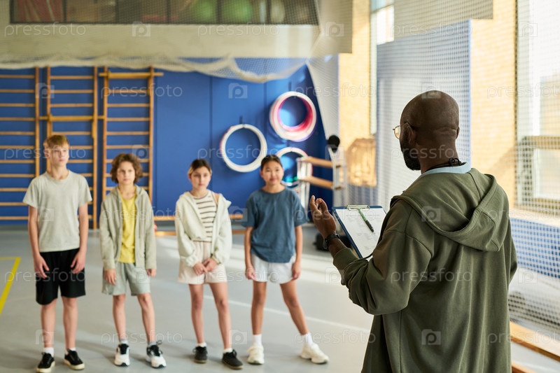Черный человек обучает группу из четырех детей в гимназии