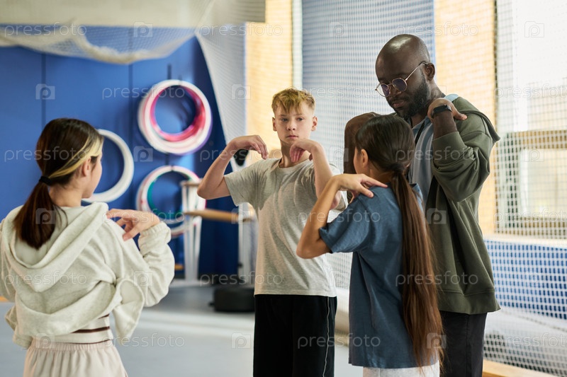 Черный мужчина обучает разных подростков практиковать танцевальные движения в помещении