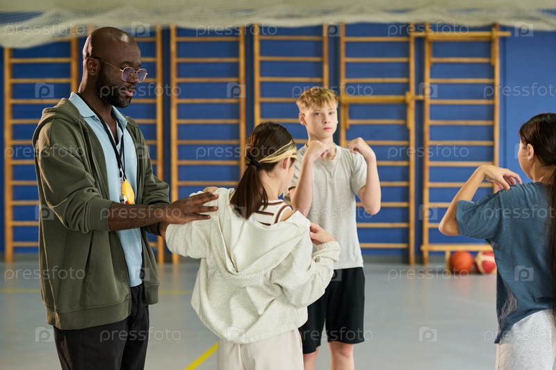 Чернокожий мужчина обучает разных подростков во время занятий спортом