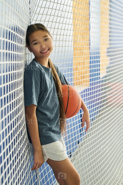 Портрет азиатской девочки-подростка, опирающейся на сеть, держащей баскетбол и улыбающейся в помещении