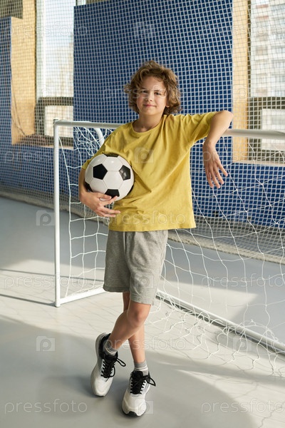 Мальчик, опирающийся на мяч для футбольного гола, держит мяч в помещении спортивного комплекса