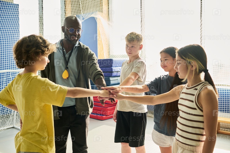 Мультиэтническая группа детей и взрослых мужчин складывают руки в командном строительстве